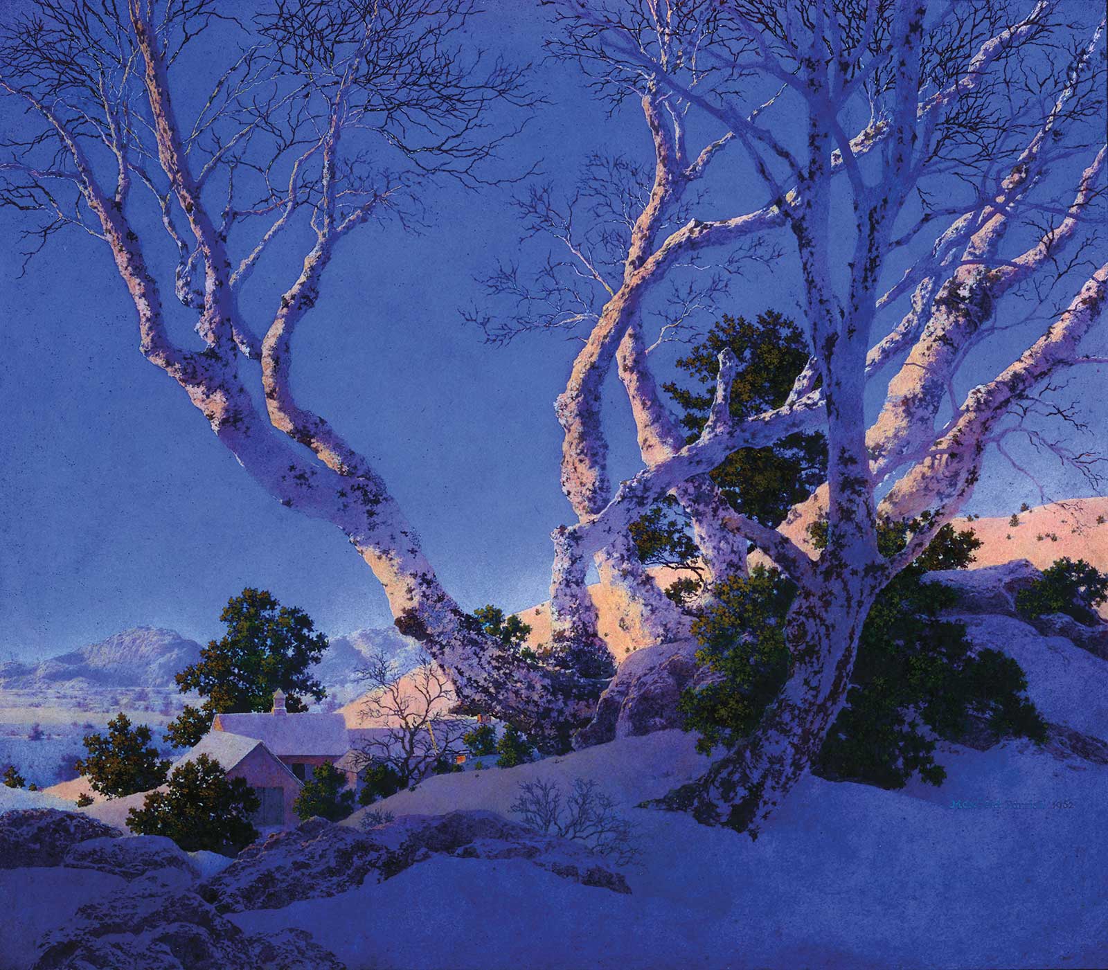 Maxfield Parrish (1870-1966), Sunrise – White Birches in a Glow, 1915. Oil on Masonite, 13½ x 15½ in., signed and dated lower right. For Brown & Bigelow Executive Print, 1955. All images courtesy National Museum of American Illustration. © 2025 National Museum of American Illustration, Newport, RI, www.americanillustration.org, and the American Illustrators Gallery, New York, NY, www.americanillustrators.com.