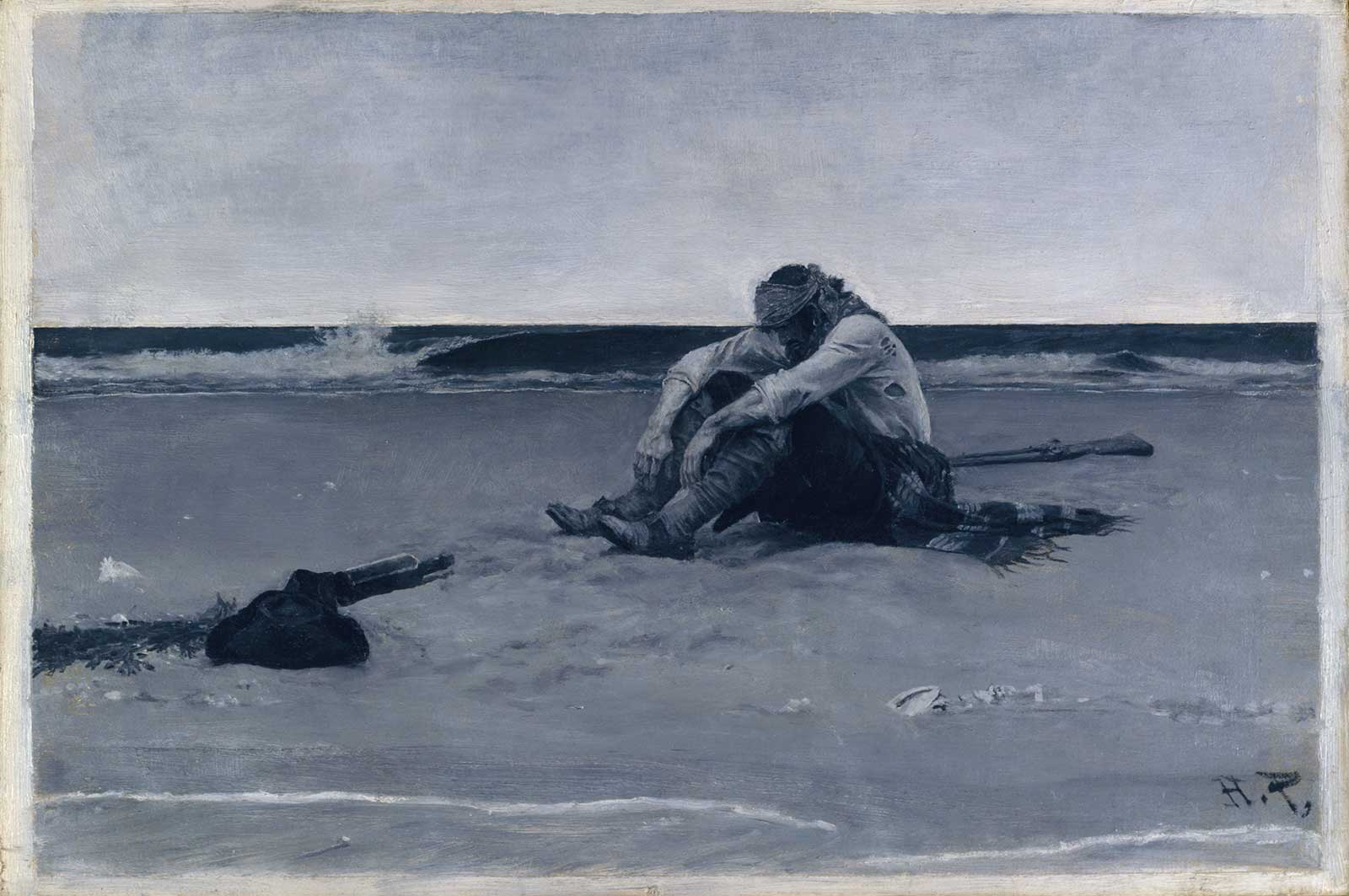 Howard Pyle (1853-1911), Marooned, 1887. Oil on board, 16 x 23 in., signed lower right. For “Buccaneers and Marooners of the Spanish Main” by Howard Pyle, Harper’s New Monthly, August/September 1887.