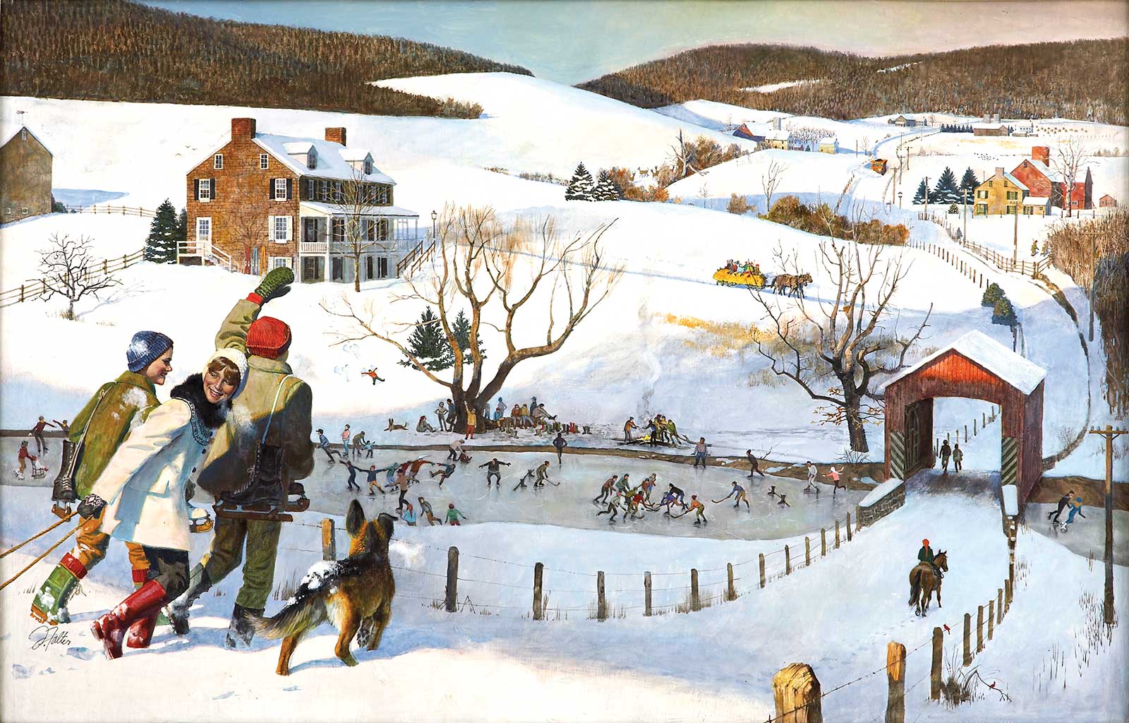 John Falter (1910-1982), Winter Fun in Bucks County, Pennsylvania, 1971. Oil on canvas, 27 x 42 in., signed lower left. For Saturday Evening Post, Winter 1971 double-page cover.