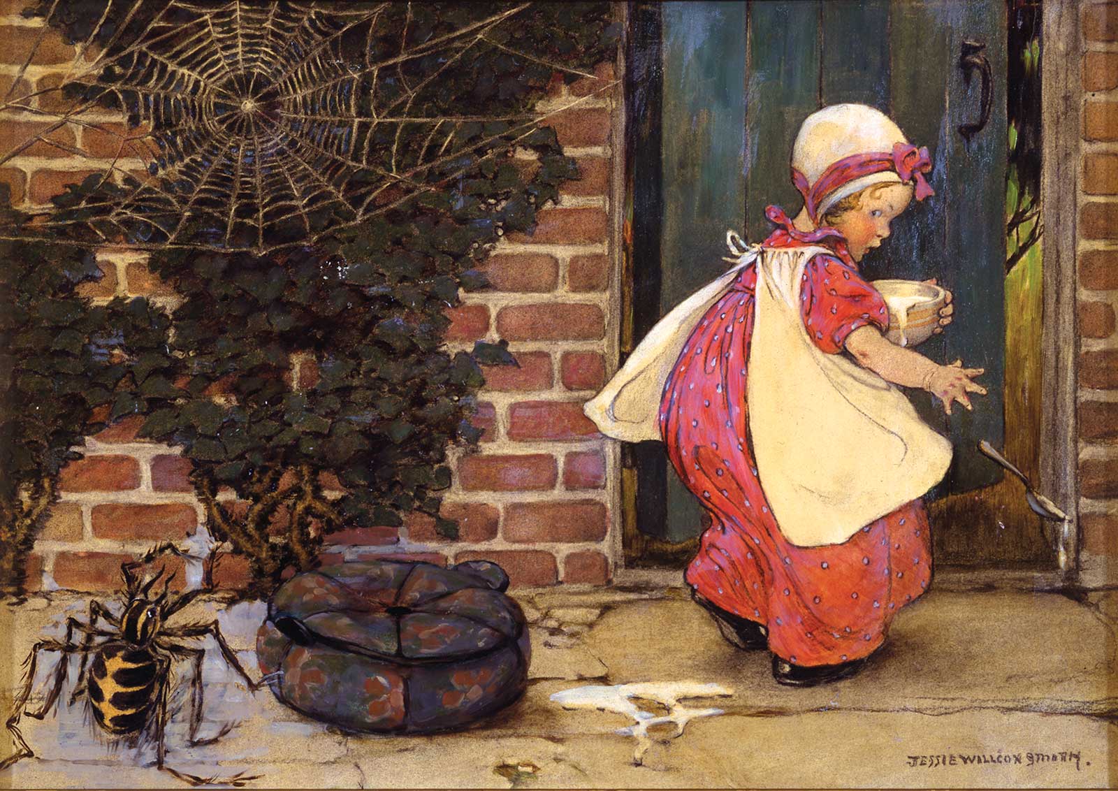 Jessie Willcox Smith (1863-1935), Little Miss Muffet, 1912. Oil on board, 18 x 25½ in., signed lower right. For Good Housekeeping Magazine, January 1913, and The Jessie Willcox Smith Mother Goose, Dodd, Mead & Co., 1914.