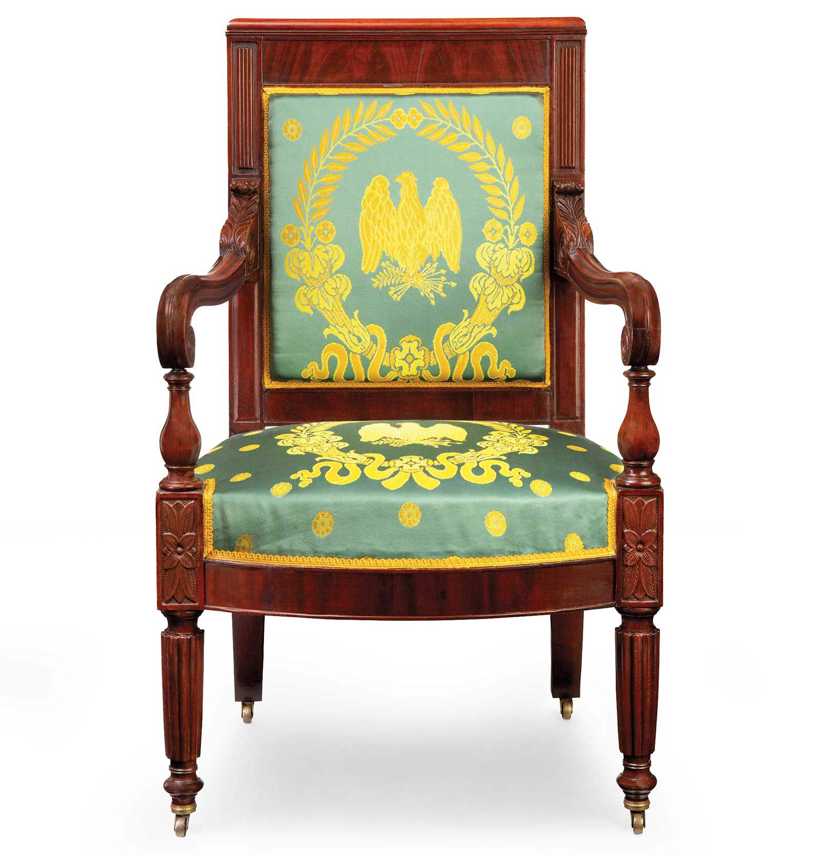 In nearby Washington, D.C., President James Monroe was eagerly furnishing the White House, or the President’s House as it was then known. Despite his penchant for European furniture in the French Empire style, the constraints of congressional purse strings necessitated purchasing furniture close to home. He commissioned cabinetmaker William King Jr. of Georgetown to produce a set of armchairs, including this example (fig. 5), for the East Room. When Monroe inevitably ran out of money, the chairs remained unupholstered until Andrew Jackson’s presidency.
