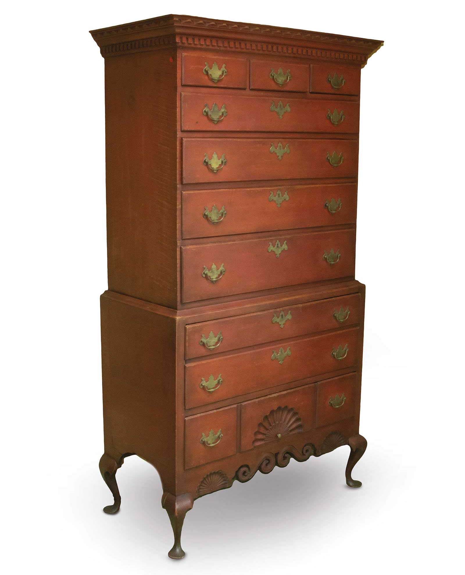 Thomaston Place Auction Galleries, Rare Dunlap two-part country Queen Anne chest on chest. Red painted maple, tiger maple and brass, height: 6 ft. x 3 in., width: 38½ in., depth: 20 in. From the estate of Linda Bean. Estimated $10/20,000 SOLD: $30,000