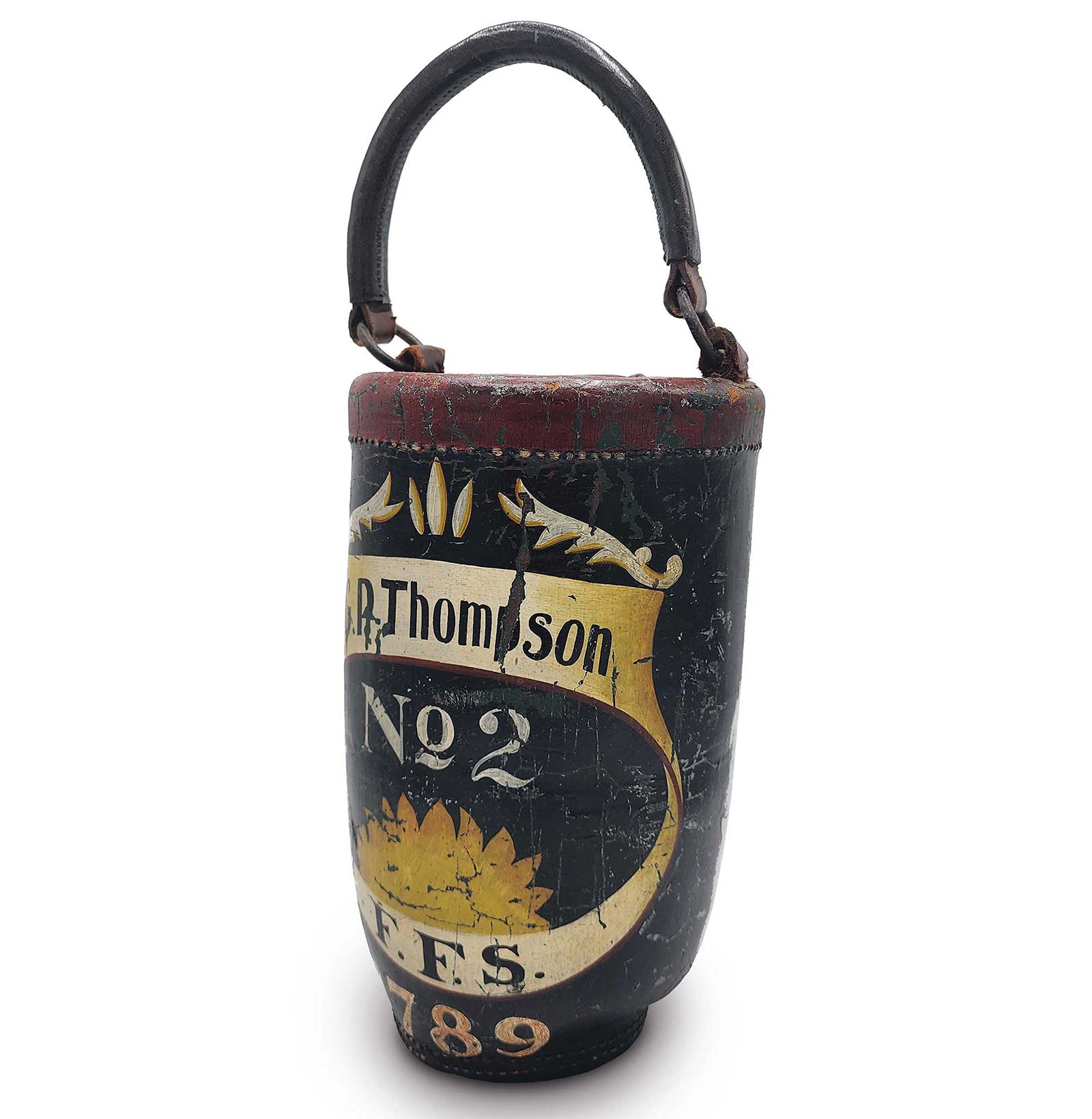 Roberto Freitas American Antiques & Decorative Arts, leather fire bucket from Portsmouth, New Hampshire, ca. late 18th / early 19th century. Painted with the initials of the Federal Fire Society, member name ‘G.P. Thompson’, ‘No. 2’, and the society’s founding date of 1789.