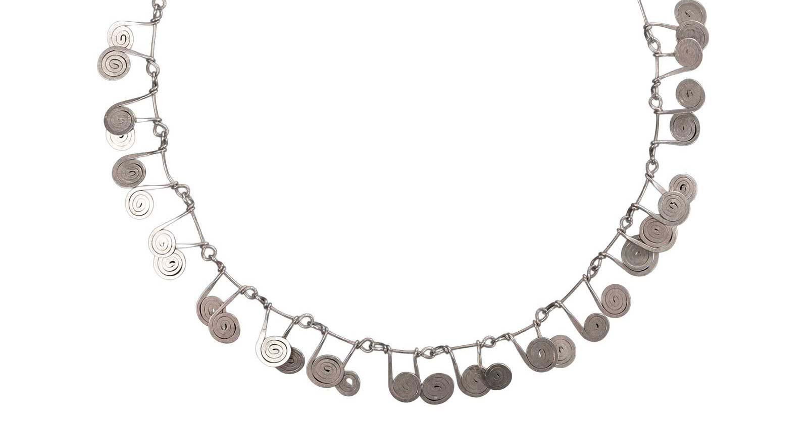 Grogan & Company, Untitled Necklace. Silver, composed of silver wire links suspending hammered silver scrolls in the form of stylized musical notes, scroll length: 5/8 to 3/4 in.; necklace length: 18 in., by Alexander Calder (1898-1977). Sold in a December 2015 sale. SOLD: $109,800