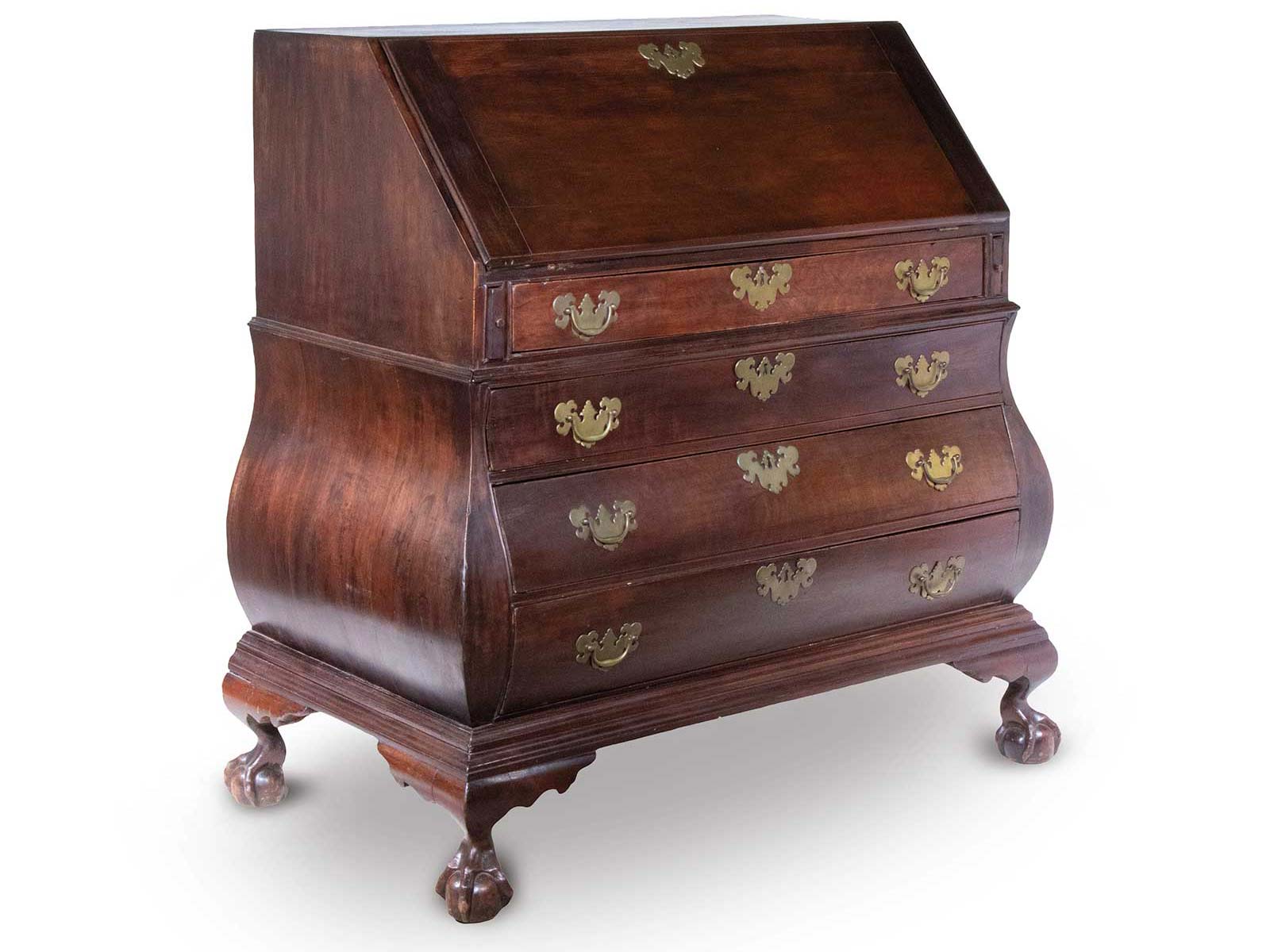 Thomaston Place Auction Galleries, Rare 18th century period Boston Chippendale Bombe Desk, ca. 1770. Walnut, brass, 46 x 45 x 26 in. From the estate of Linda Bean. Estimated $30/45,000 SOLD: $60,000