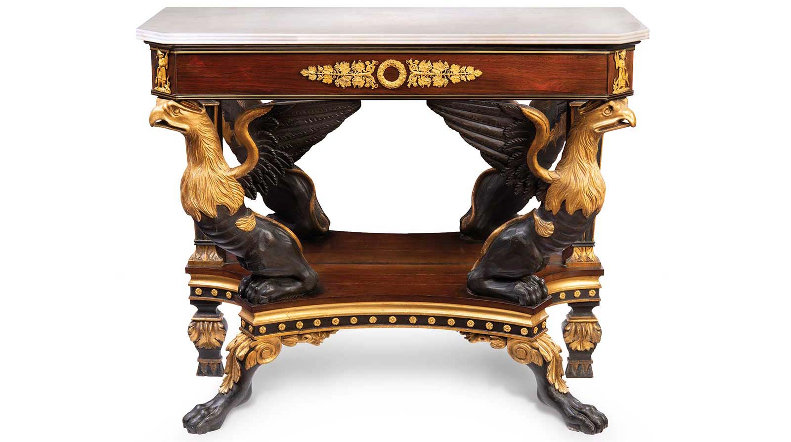 However, American artisans were not mere imitators. Instead, they distilled and enhanced forms from European precedents until American Classicism emerged as a distinct style appropriate for a young republic with democratic ideals. Eschewing the excessively gilded ornamentation common in France and England, American cabinetmakers nevertheless experimented with bold expressions of furniture ornamentation to mimic ancient surfaces: painting, gilding, vert antique, ormolu mounts, brasses, molded glass, inlay, exotic woods, marble and sculptural carving.