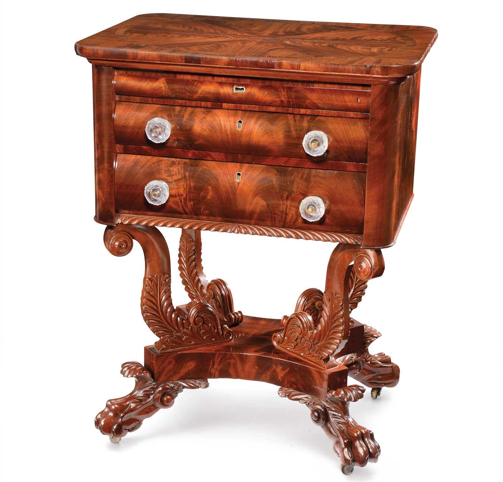 Take this pair of worktables (fig. 1-2) by the Philadelphia cabinetmaker Anthony Gabriel Quervelle. The worktable became a mainstay of women with means to facilitate domestic activities such as reading, writing and sewing. Commissioned as a pair for Robert Griffith and his wife Maria, they were part of a suite of furniture the young couple ordered from the cabinetmaker for their home in Philadelphia. The Griffiths clearly wanted to make a statement, and the level of sculptural carving, choice mahogany, and Prussian blue leather interior demonstrate their desire to showcase their wealth and status.