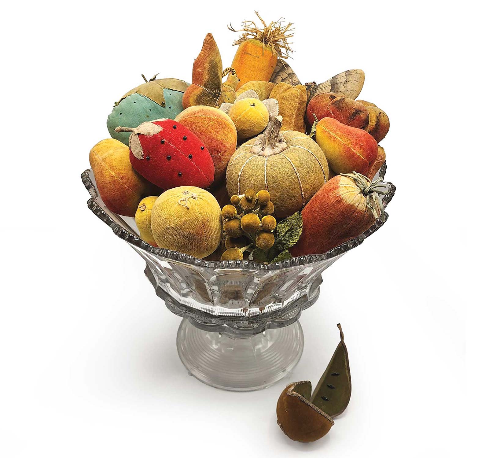 Roberto Freitas American Antiques & Decorative Arts, collection of velvet fruit, vegetables and butterflies, presented in a glass bowl, American, ca. mid 19th-century.
