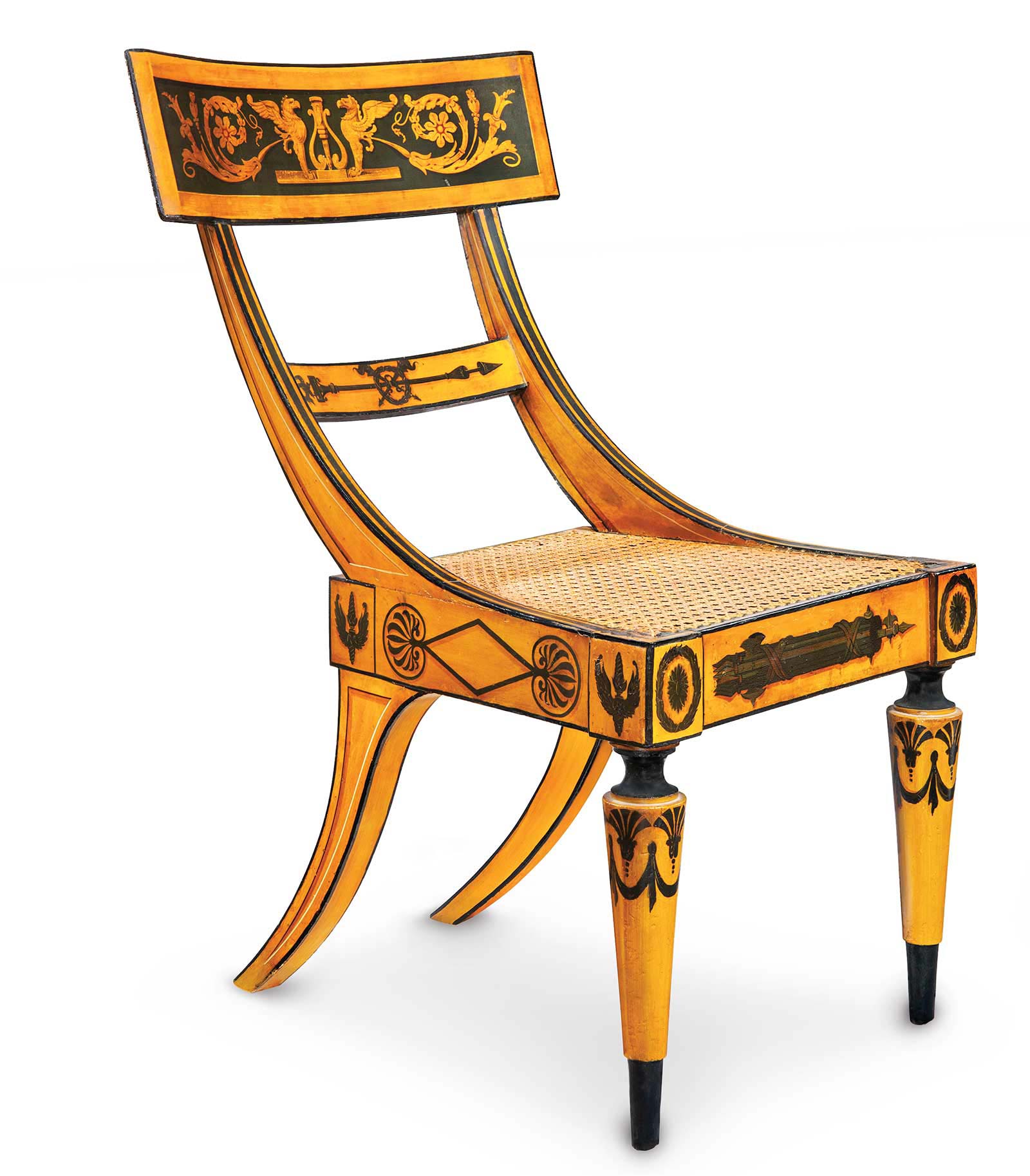 At the forefront of the painted furniture industry in Baltimore were the brothers John and Hugh Finlay. Paint was a far more economical surface treatment than brass or gilding, which led to its popularity. However, the Finlays produced highly intricate designs drawn from European pattern books, such as this spectacular side chair (fig. 4) from an original set of 12.