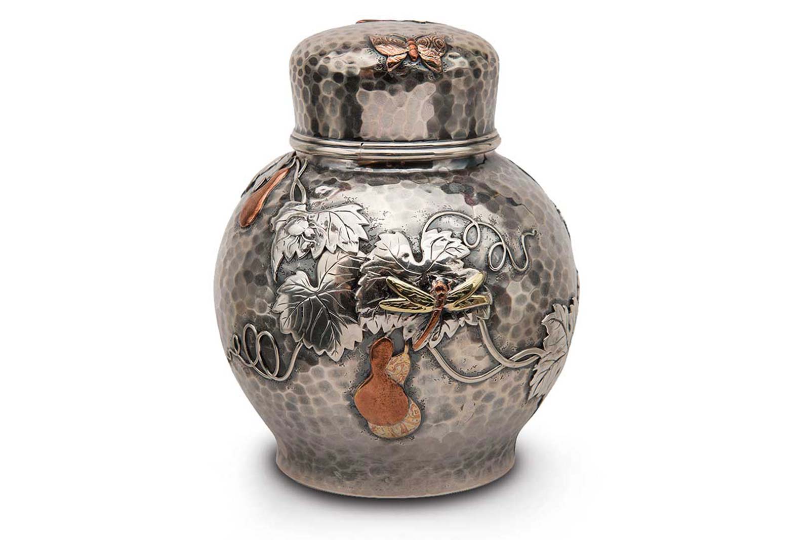 Grogan & Company, Tiffany & Co. Japanesque Tea Caddy, New York, ca. 1880. Hammered silver and mixed metal, 4¾ in. SOLD: $17,080