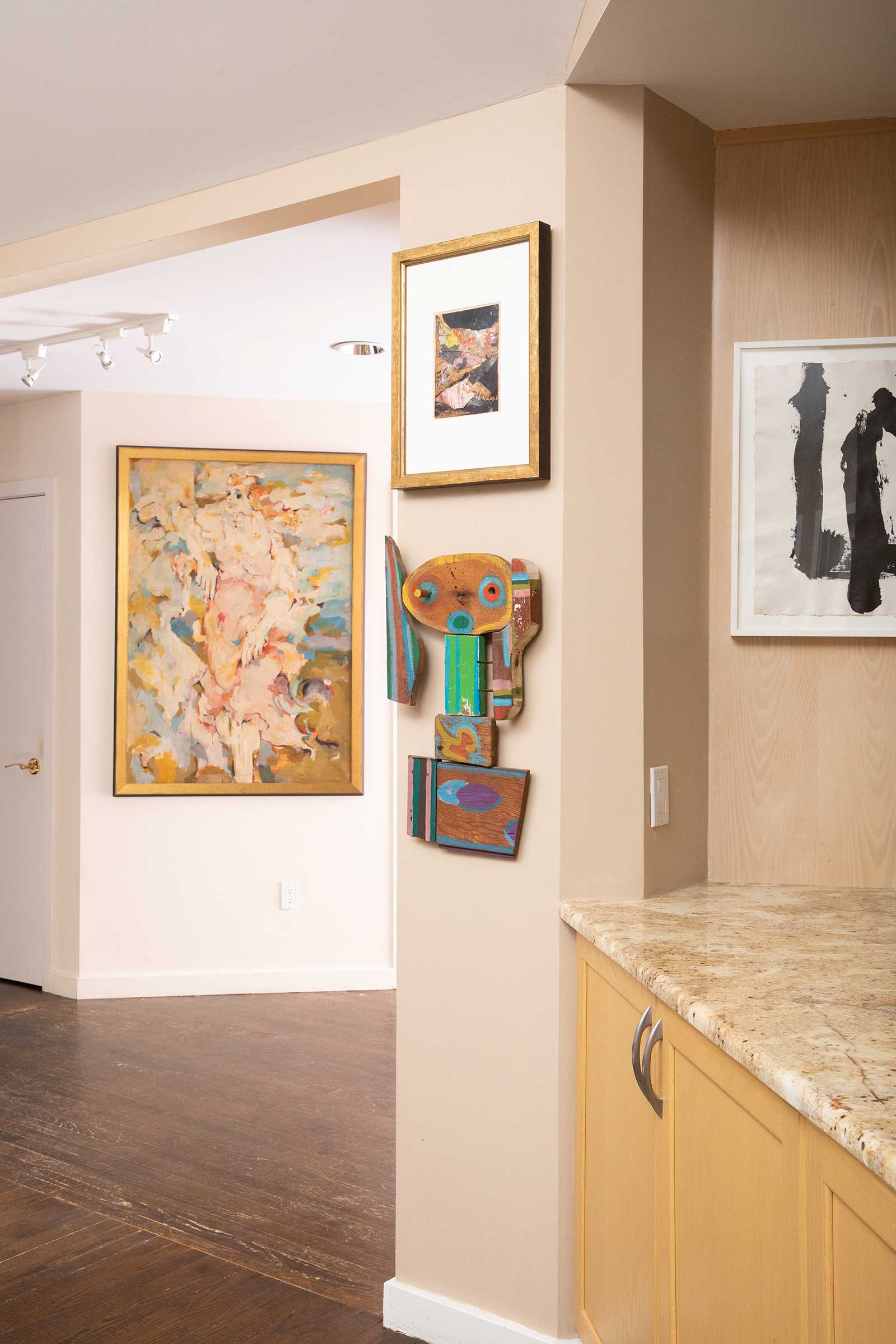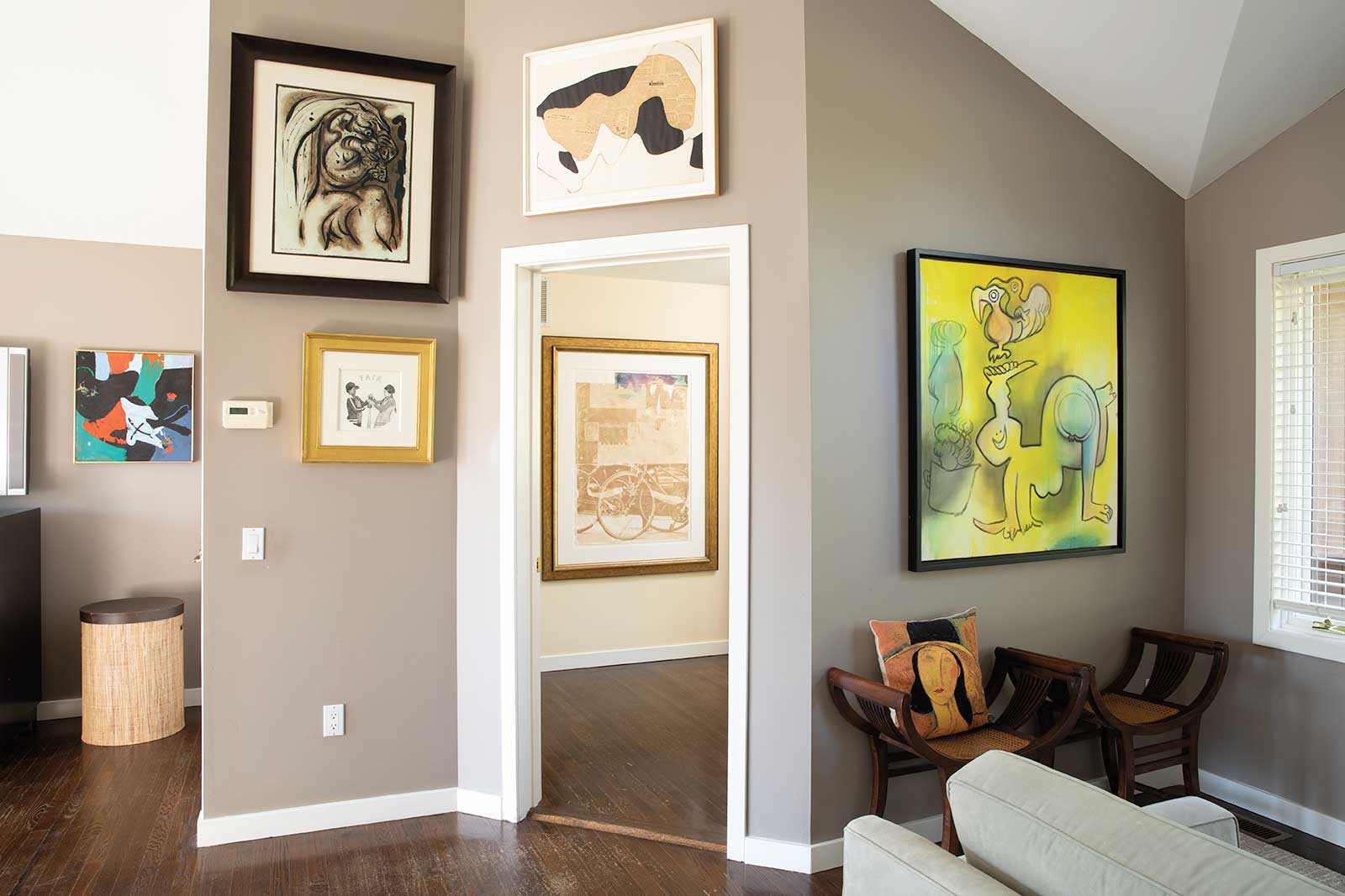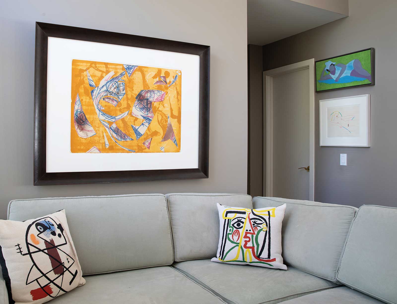 Above the sofa is September Twenty-third, 1980, torn 1960s pastel artwork on acrylic background on paper, by Lee Krasner (1908-1984). In the hallway are (top to bottom) Resting on the Green Grass, 1968, oil on canvas, by March Avery, and Study for Kate Nude, 1984, Liquitex on paper, by Tom Wesselmann (1931-2004).