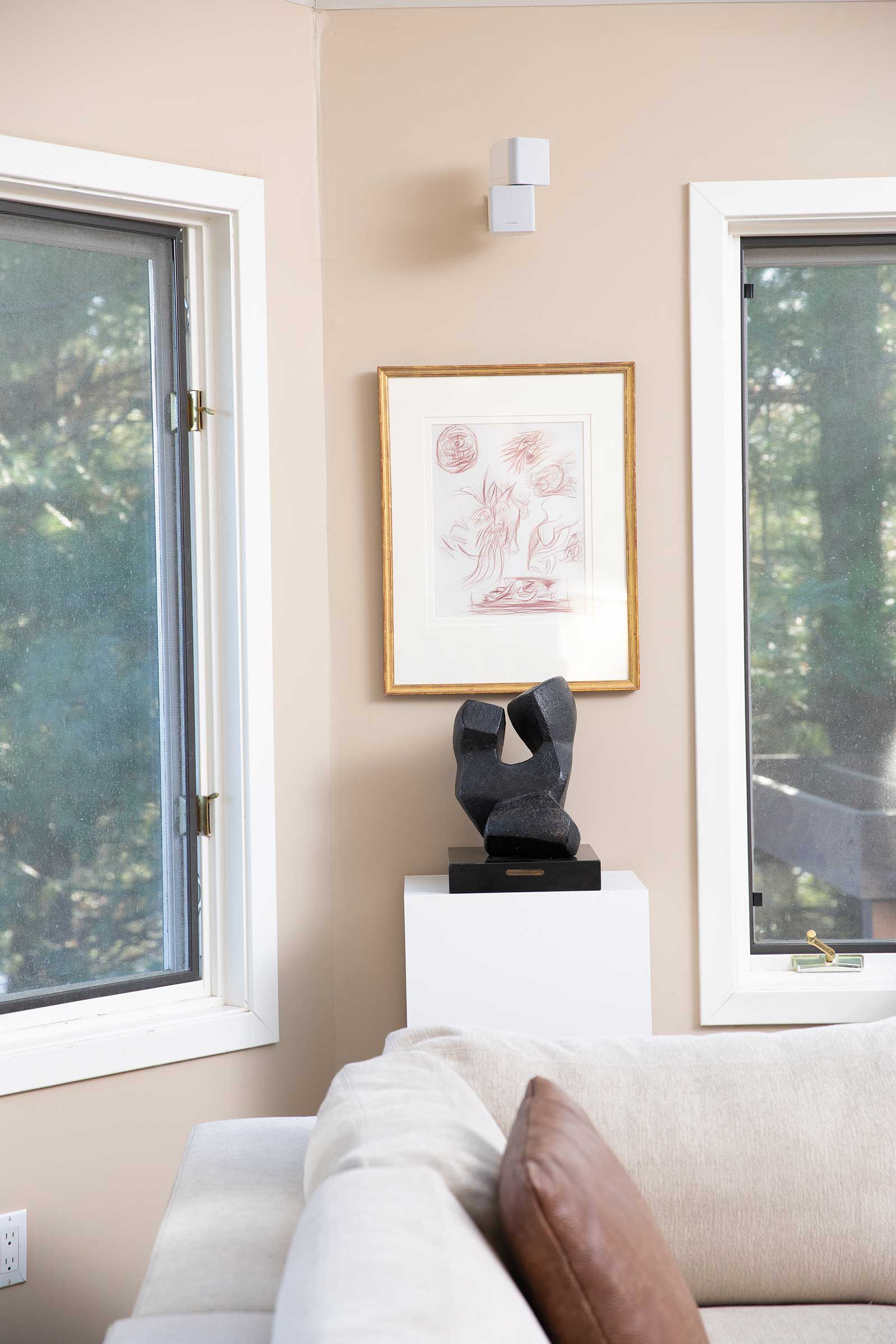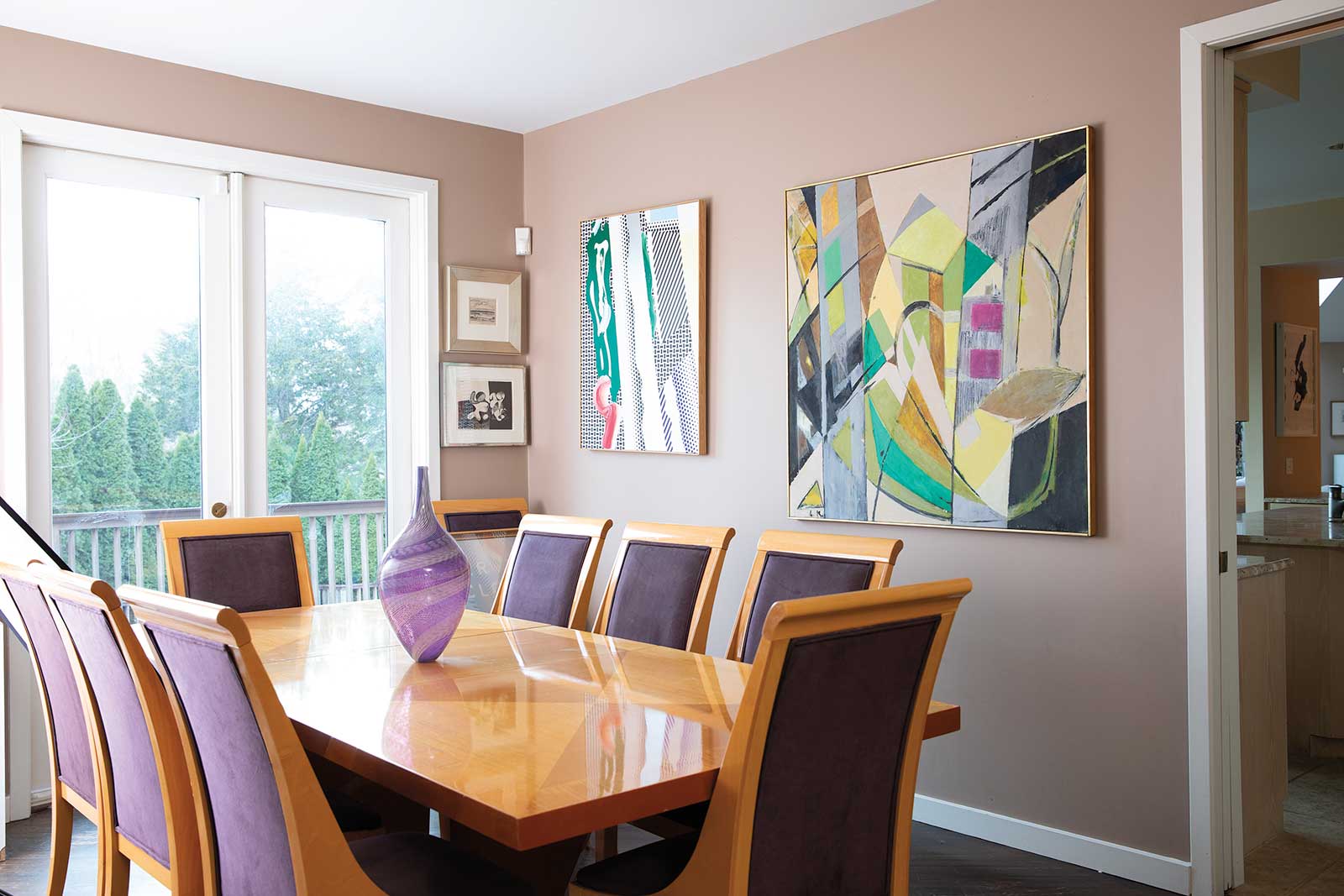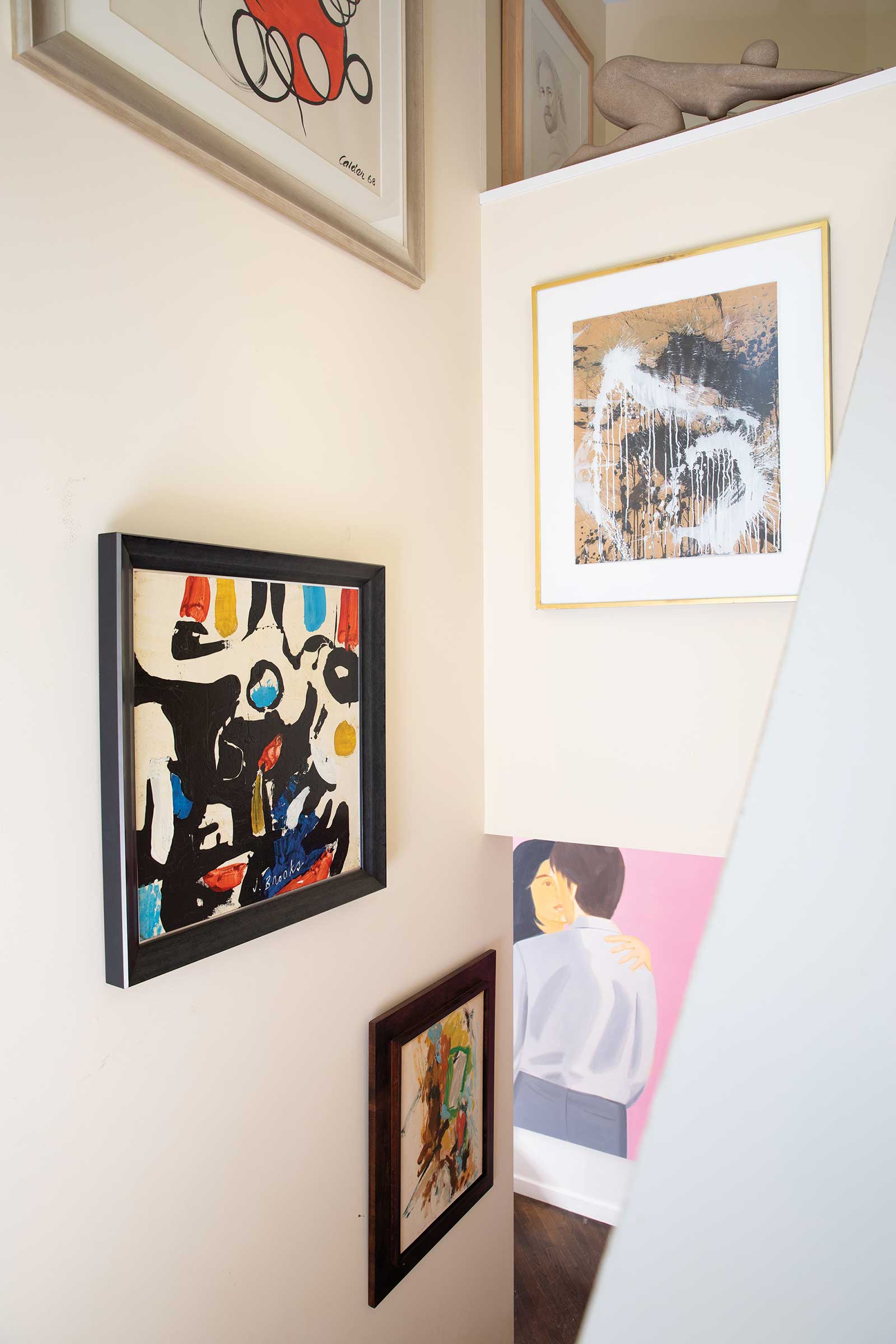 Above the sofa is September Twenty-third, 1980, torn 1960s pastel artwork on acrylic background on paper, by Lee Krasner (1908-1984). In the hallway are (top to bottom) Resting on the Green Grass, 1968, oil on canvas, by March Avery, and Study for Kate Nude, 1984, Liquitex on paper, by Tom Wesselmann (1931-2004).