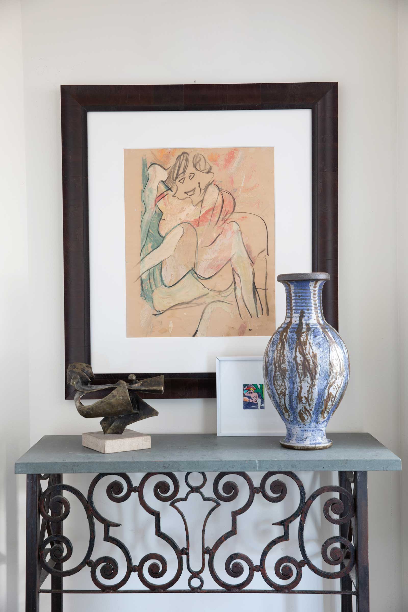 Woman, 1964, acrylic on paper, by Willem de Kooning (1904-1997) hangs above (left to right) Voyager, ca. 1960, by Seymour Lipton (1903-1986); Study for Sunset Nude, 2002, ink and pastel on paper, by Tom Wesselmann (1931-2004); and a ceramic vase, 1955, by Peter Voulkos (1924-2002).