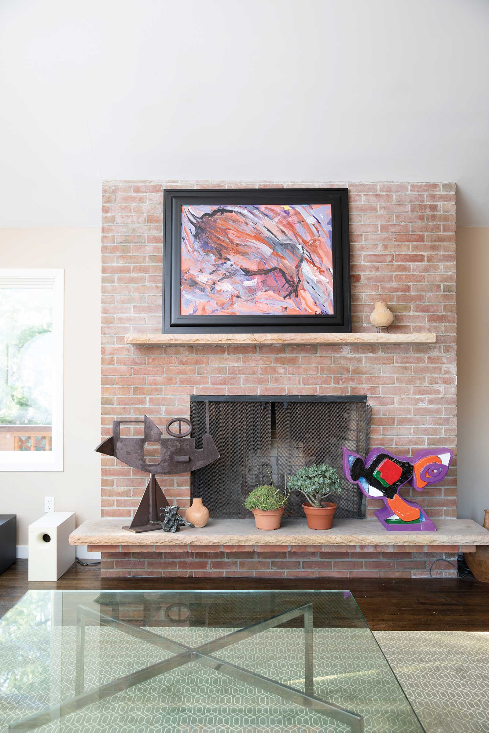 Above the mantel is Cave No. 24, ca. 1958, acrylic on paper on canvas by Elaine de Kooning (1918-1989). On the hearth are (left to right), a steel sculpture, 1960, by Wilfrid Zogbaum (1915-1965); a metal maquette, Woman, ca. 1975, by Willem de Kooning (1904-1997); and Violet Bird, 1974, painted ceramic by Karel Appel (1921-2006).