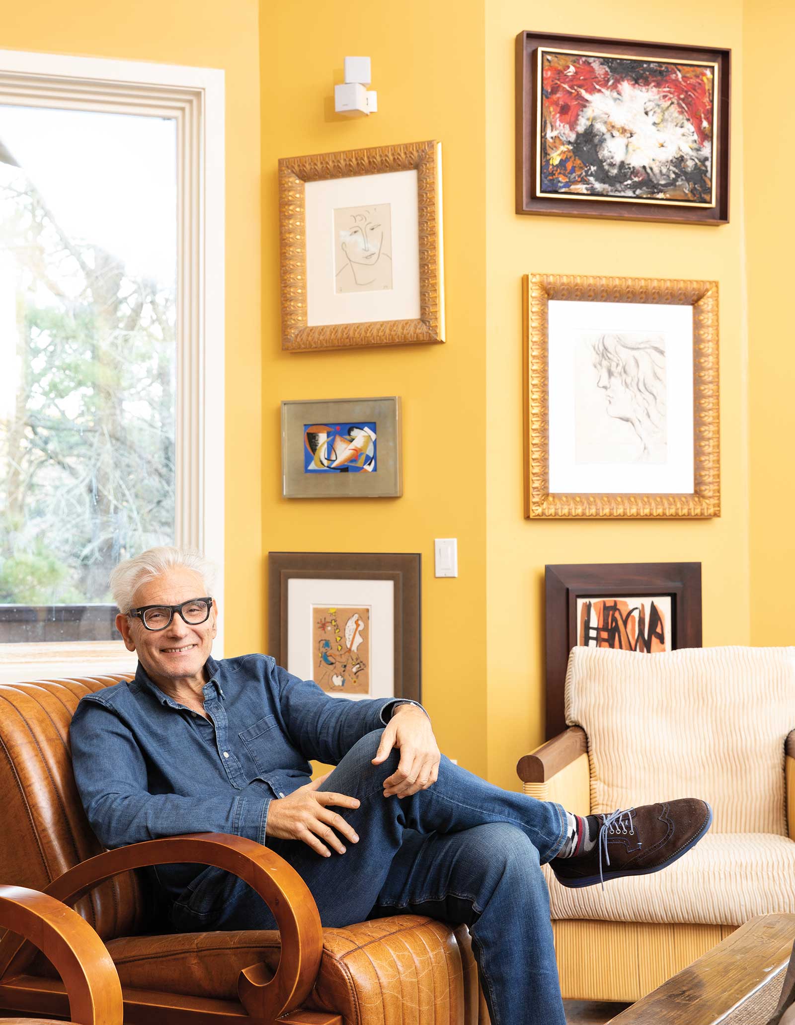 Rick Friedman sits beneath (top to bottom) Face, ca. 1955, ink on paper, by Henri Matisse (1869-1954); Gouache, #5, 1942, gouache on board by Lee Krasner (1908-1984); and Untitled, 1943, black ink and gouache on purple paper, by Jackson Pollock (1912-1956). On the adjoining wall are (top to bottom) Untitled, 1958, oil on board, by Alfonso Ossorio (1916-1990); Untitled, 1976, charcoal on paper, by Cy Twombly (1928-2011); and Untitled, 1948, oil, watercolor, paper collage on paper on canvas, by Elaine de Kooning (1918-1989).