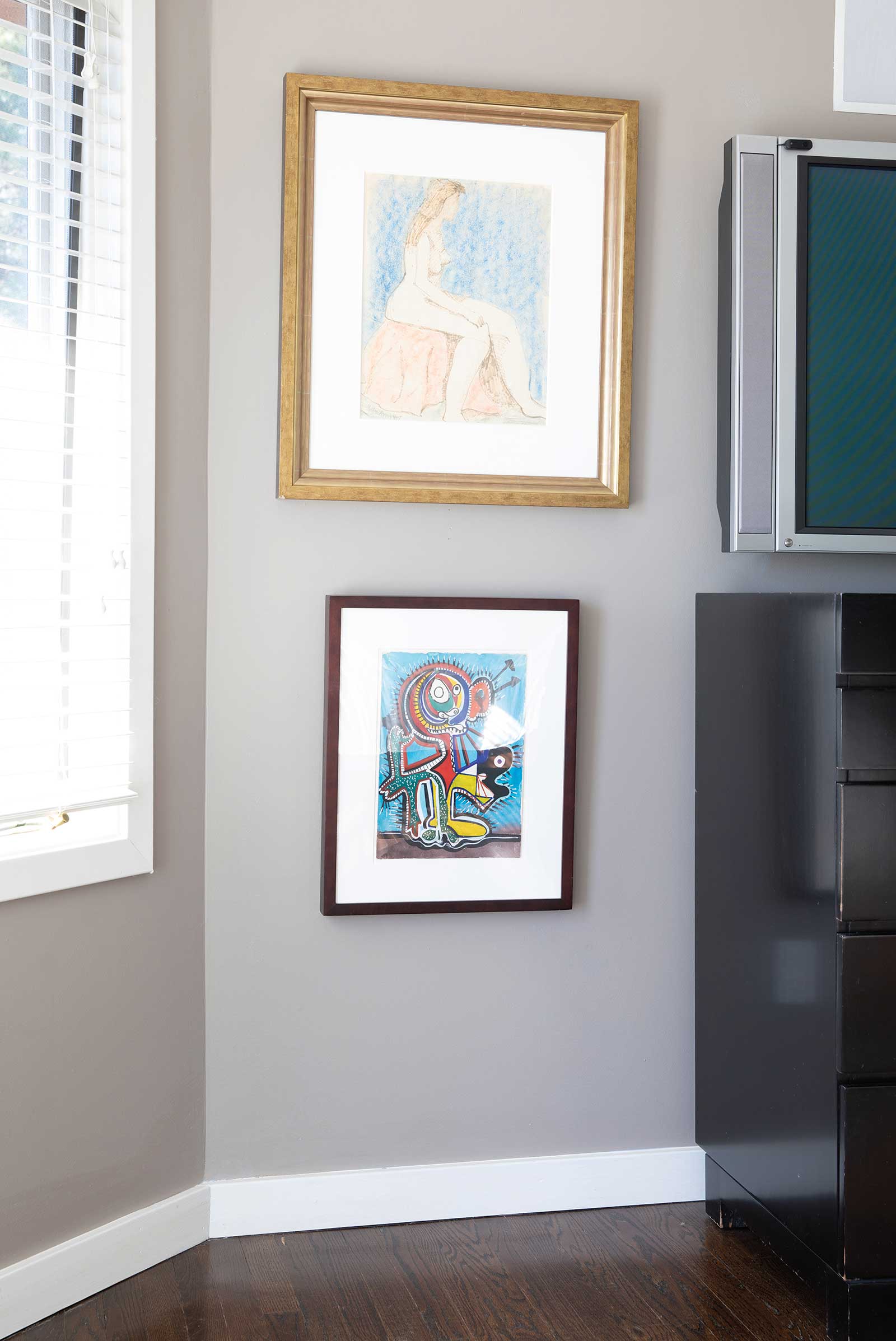 Seated Nude (March Avery), 1957, crayon and ink on paper, by Milton Avery (1885-1965) hangs above Figure with Arrow, 1939, gouache and watercolor on paper, by William Baziotes (1912-1963).