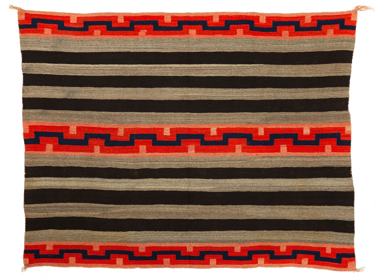 Handspun yarns, indigo blue, natural brown, red and pink. 47 x 59 in.
